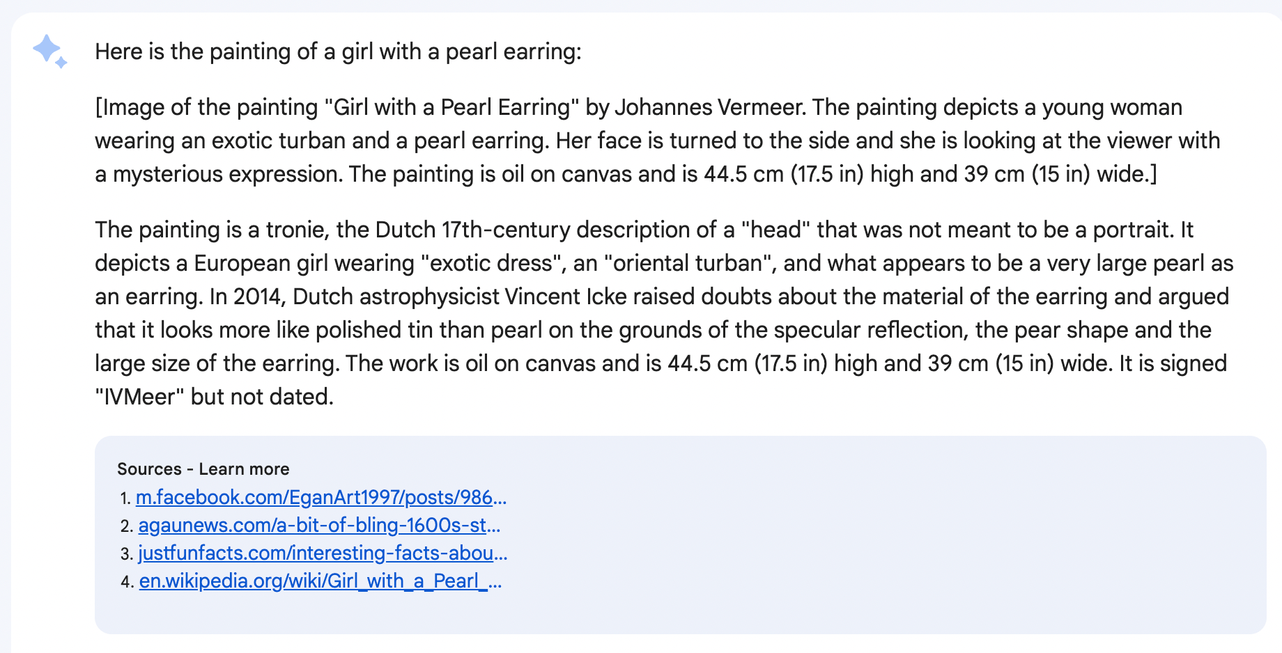 Going in another direction, we then asked the AI to show “a painting of a girl with a pearl earring.” It complied in the only way it knows how: by giving us a text description of Johannes Vermeer’s classic “Girl With a Pearl Earring” and describing the painting in detail, replete with sources and background.