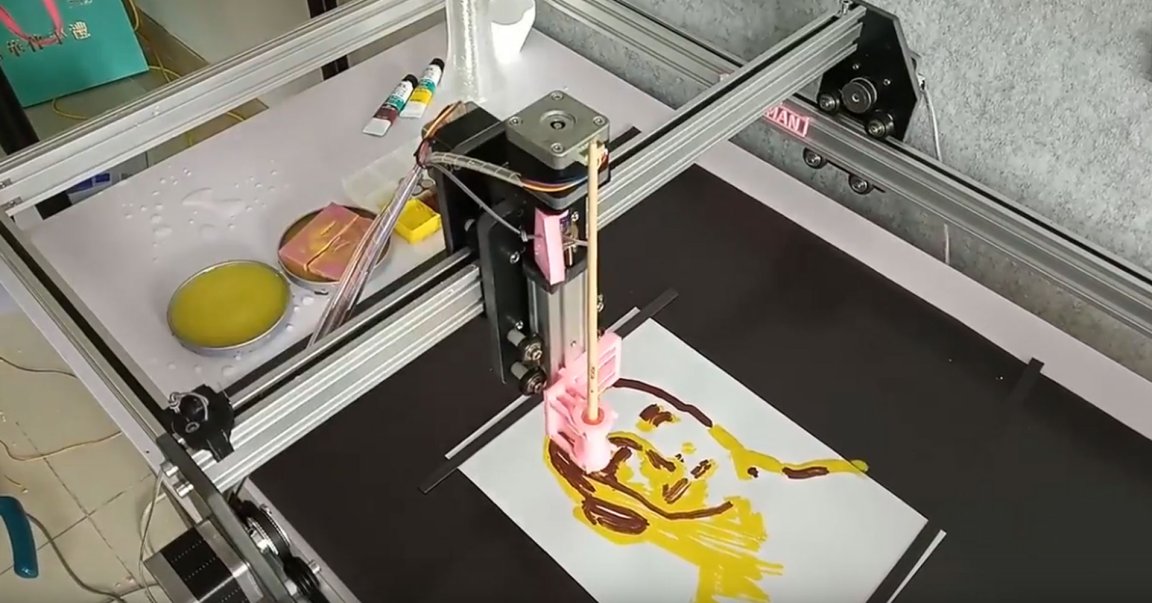 The device looks sort of like a 3D printer. A robotic arm hangs and rapidly glides around above a blank canvas, darting about in three dimensions as it paints precise images, then cleans and swaps out its paintbrushes to start over with a new color.