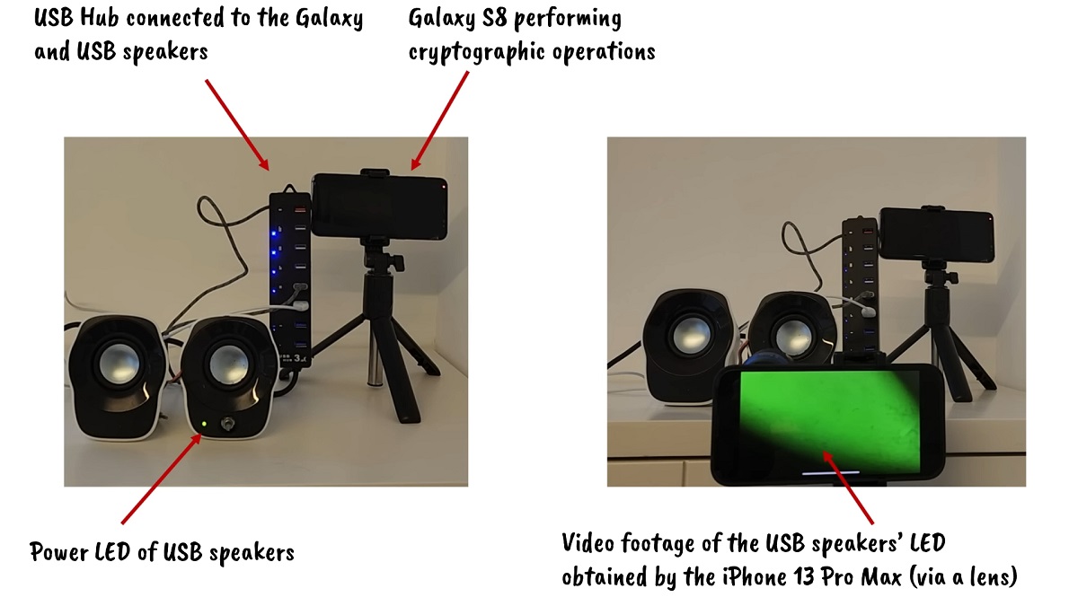 In another study, they were able to take iPhone footage of the power LED of Logitech speakers that were hooked up to an USB hub that was also charging a Samsung Galaxy S8 smart phone. From looking at the speakers’ power LED and analyzing its colors and brightness, the team says they were able to uncover the 378-bit key for the Samsung Galaxy — a remarkable scenario because the key was solved indirectly by looking at another connected device.