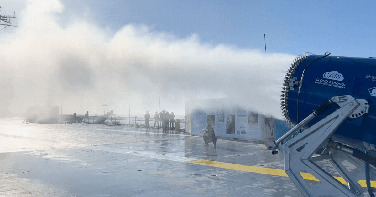 In their experiment conducted last month, the researchers tested their snowmaker-like device for dispersing aerosols, the Cloud Aerosol Research Instrument (CARI), on the flight deck of the decommissioned aircraft carrier the USS Hornet.