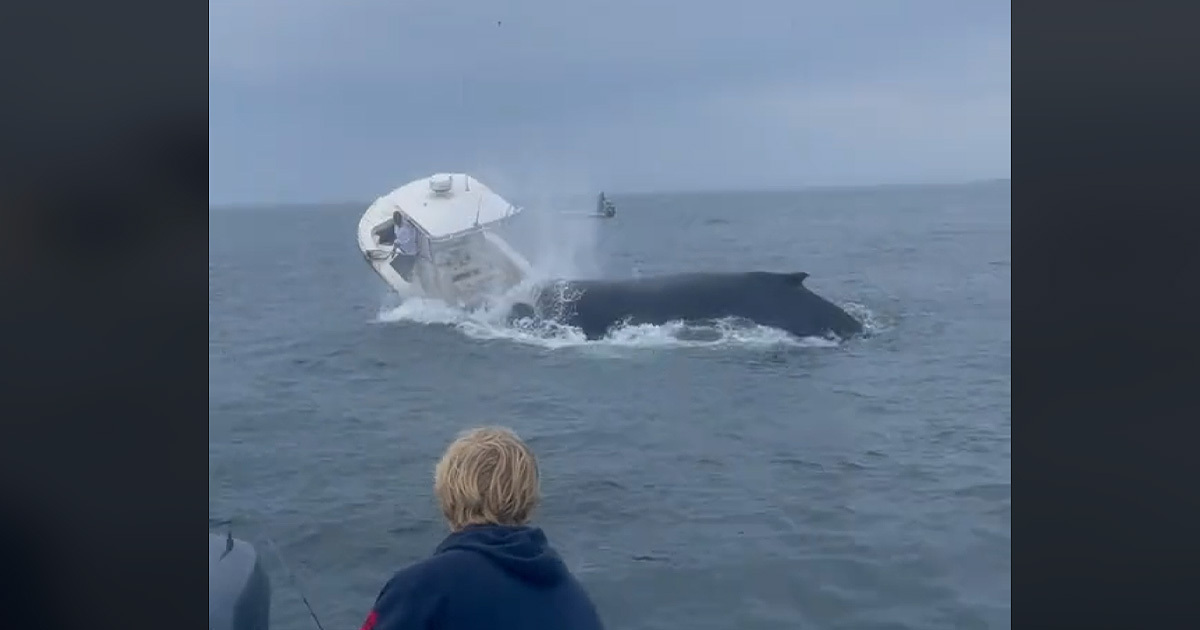 In a scene straight out of Herman Melville’s Moby Dick, a humpback whale breached the waters off New England and body slammed a small fishing boat into capsizing, USA Today reports, tossing two hapless fishermen overboard.