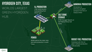 The image below from GHI’s website shows the process of converting renewable energy from wind and solar farms into ammonia and rocket fuel. The key to scaling up production, the company says, is the large salt storage capability found in underground salt domes.