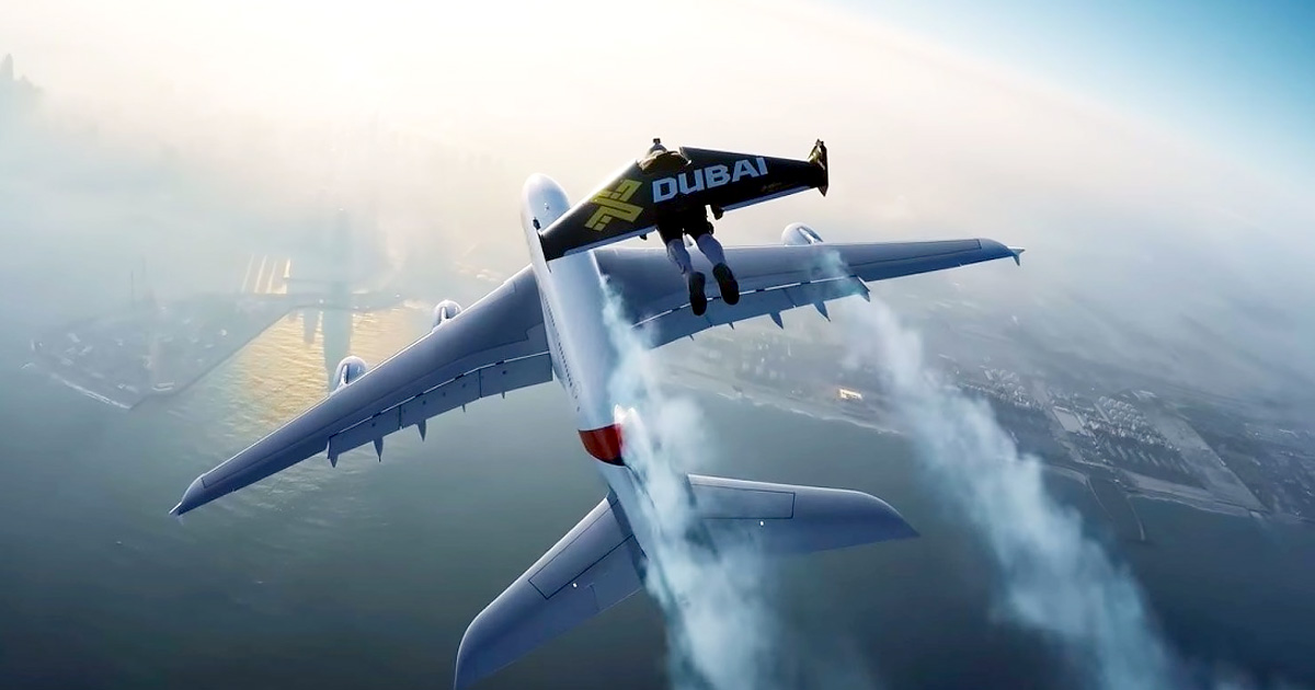 Reffet and his team have made several incredible appearances, including screaming through the air at up to 124 mph (200 kmh) after hurtling out of a plane circling over Dubai. Reffet and his fellow jetpack pilot Yves Rossy even flew alongside a jumbo jet during one daring stunt in 2015.