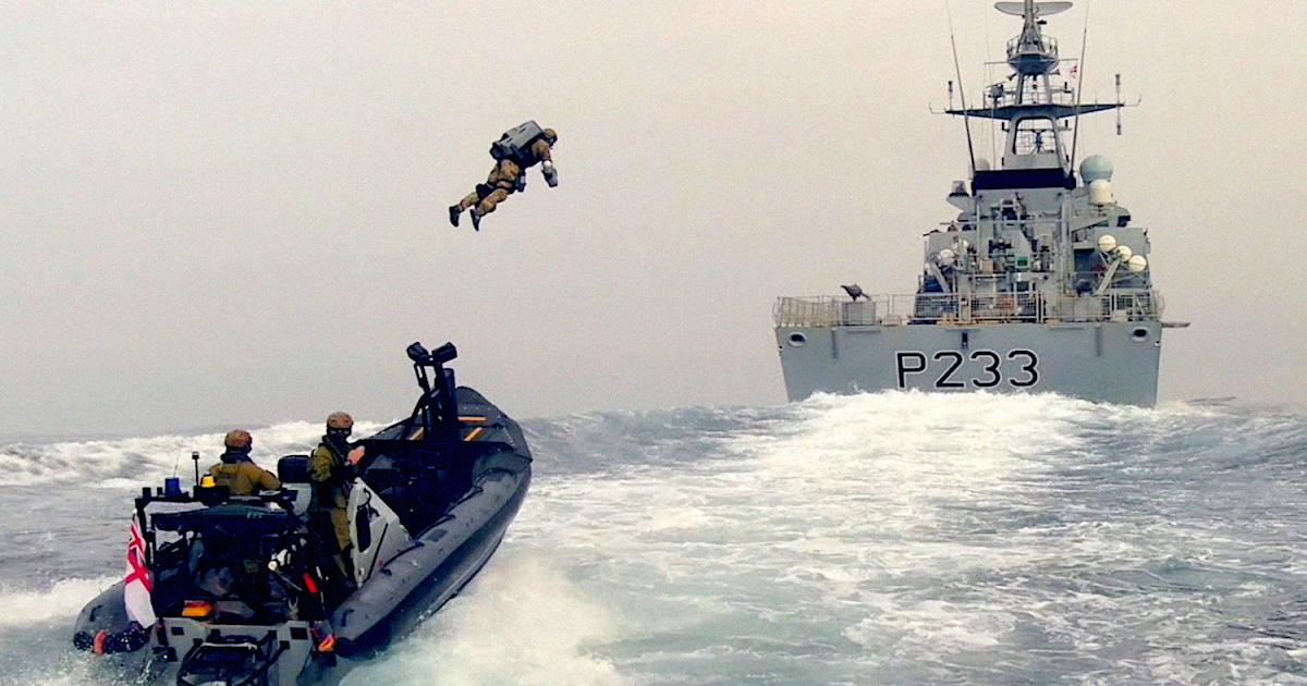 A new video uploaded by UK-based jetpack maker Gravity Industries shows a Royal Marine using a jet engine-powered suit to land on a nearby ship after approaching it on a powerboat. In one iteration of the exercise, the soldier lands on the ship and then pulls out a handgun — a preview of how military and police want to use jetpacks for rapid infiltration missions.