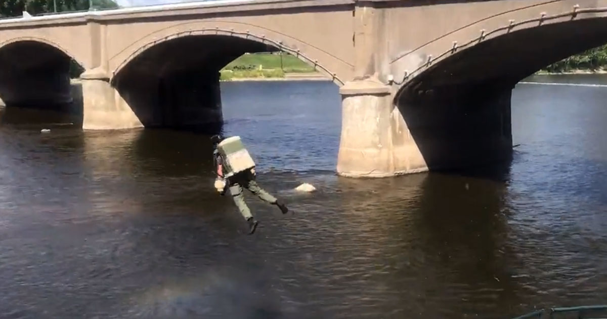 Residents in downtown Grand Rapids, Michigan, were shocked to see a man in a jetsuit blast over the city’s Grand River, and even dive through an arch of a nearby bridge earlier this week.