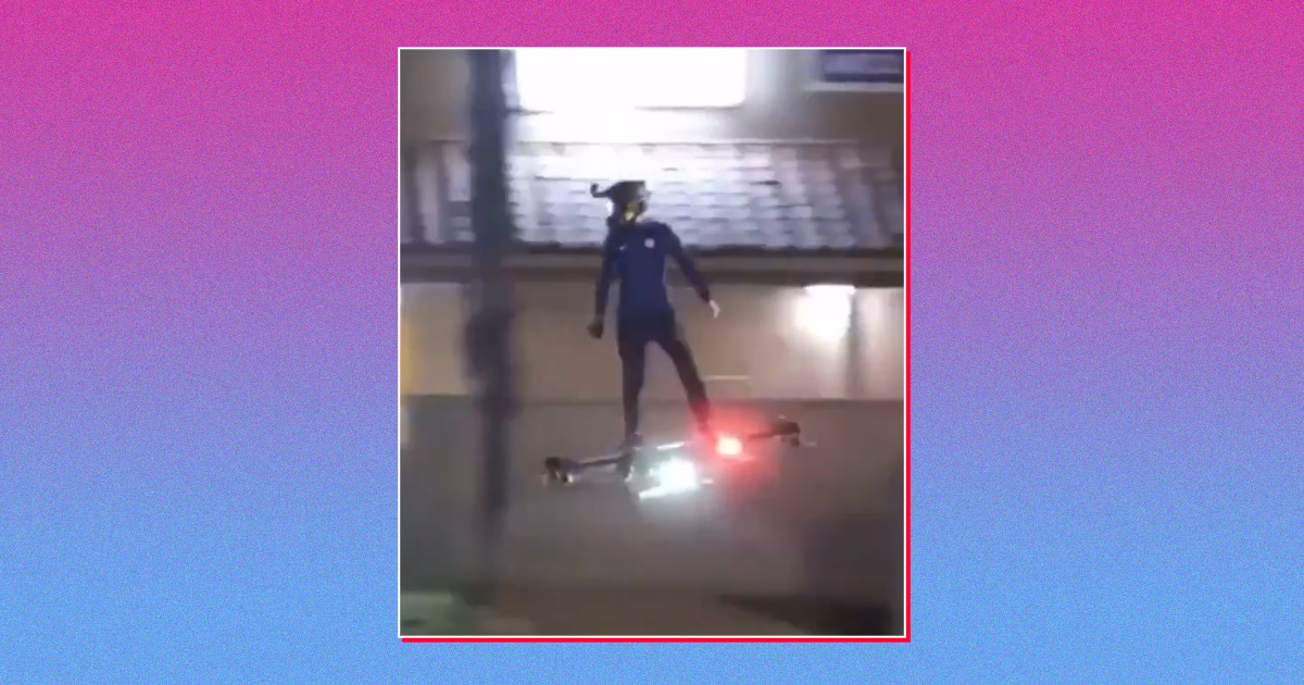 In a new viral video captioned “this man is living in 2030,” a person can be seen zipping along a public road, riding on top of what looks like a high-powered drone with eight propellers.