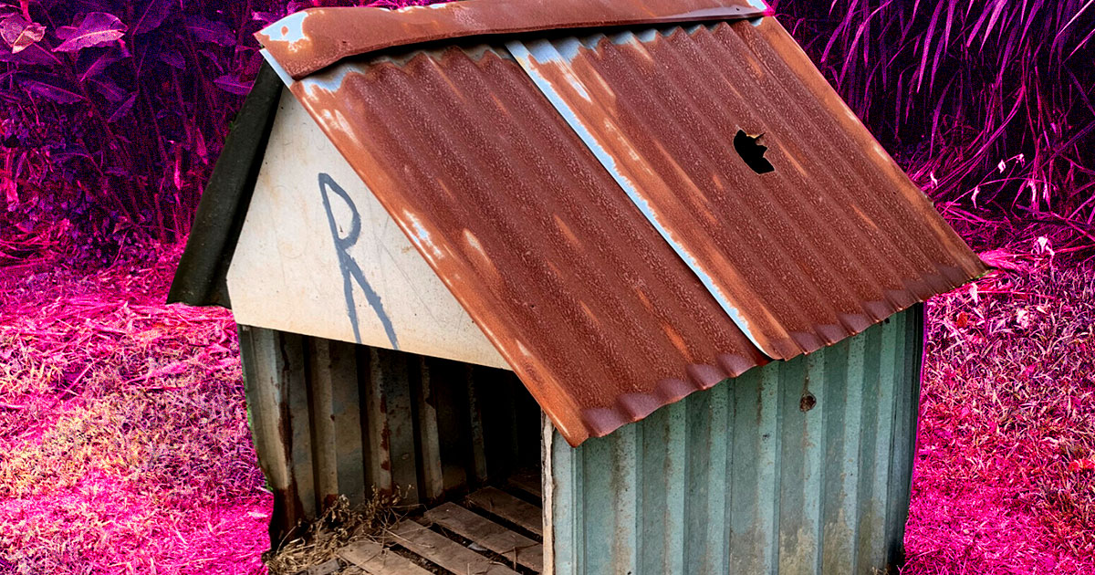 For your money, you also get a doghouse made of “pressed wood with an oxidized tin roof.” Of course, it also has the words “House” and “Roky” sketched in pencil on the front.