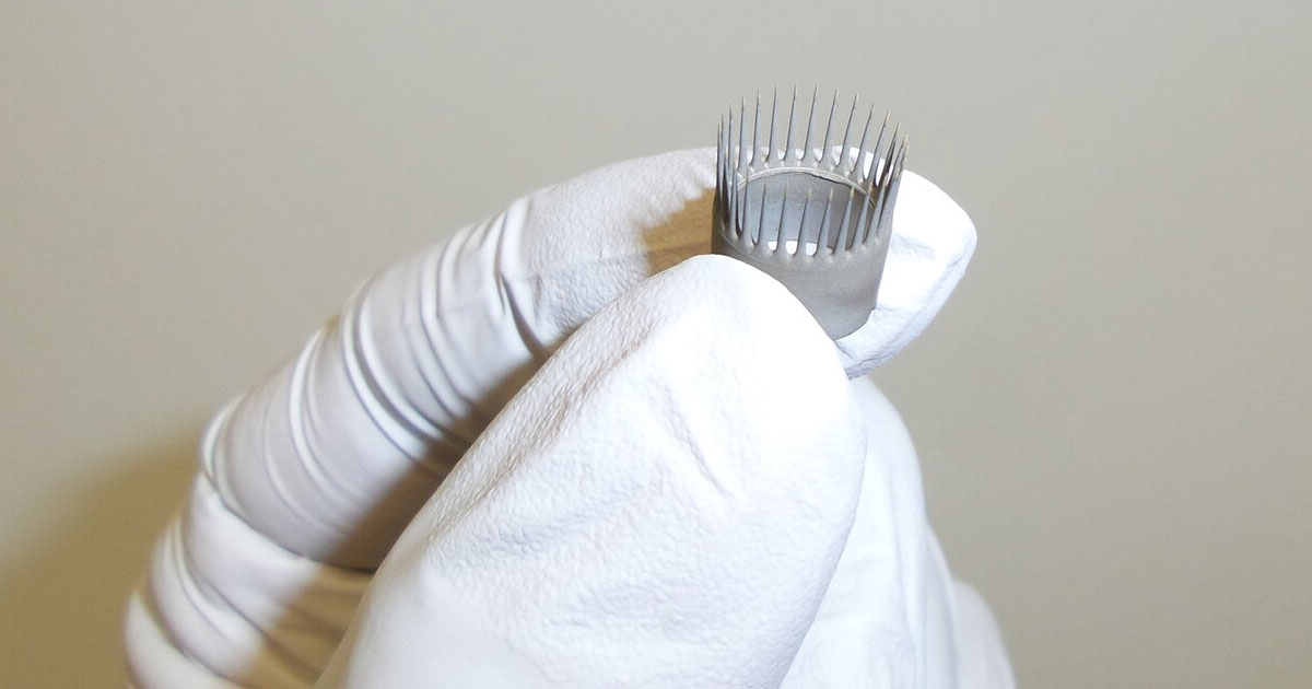 Liquid metal forming on a tiny spiked crown made of tungsten generates an electric field and shoots out positively charged ions, providing thrust. The crown is made up of 28 tiny needles and is just a single centimeter in diameter, less than half the diameter of a quarter.