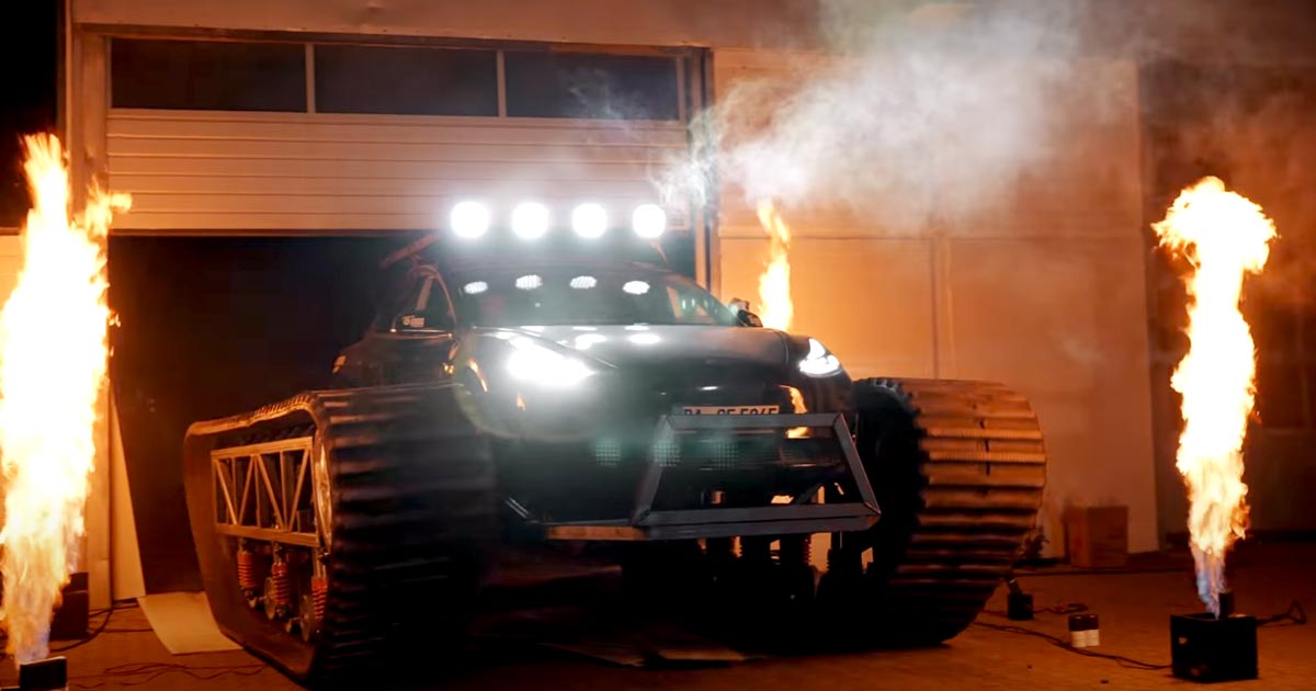 As seen in an eight minute YouTube video, the gearheads spent four weeks adding giant chain tracks to the car, turning an otherwise pedestrian sedan into a six-ton, fully electric off-roading rampager.