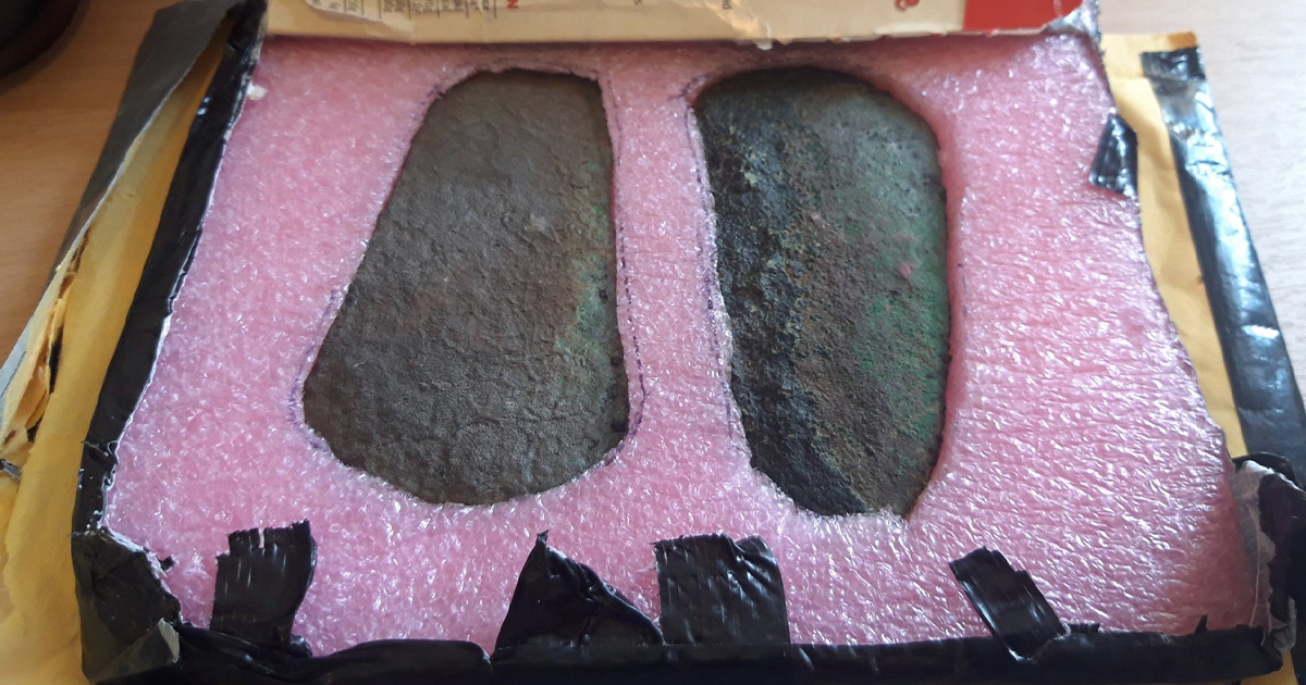 Whoever found them did their due diligence. The NMI gratefully noted in a statement that the flat axeheads were “thoughtfully” packaged inside a cardboard box originally used to hold breakfast foods, with foam padding cut to their exact shapes.