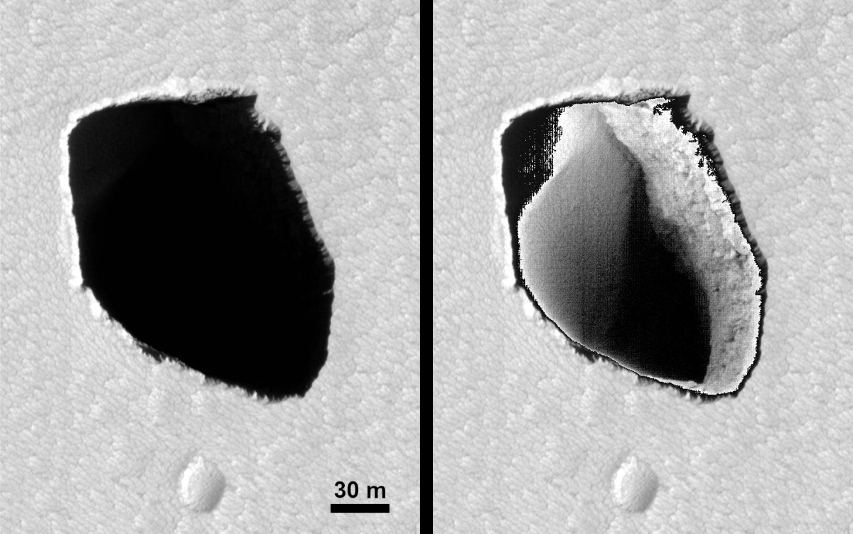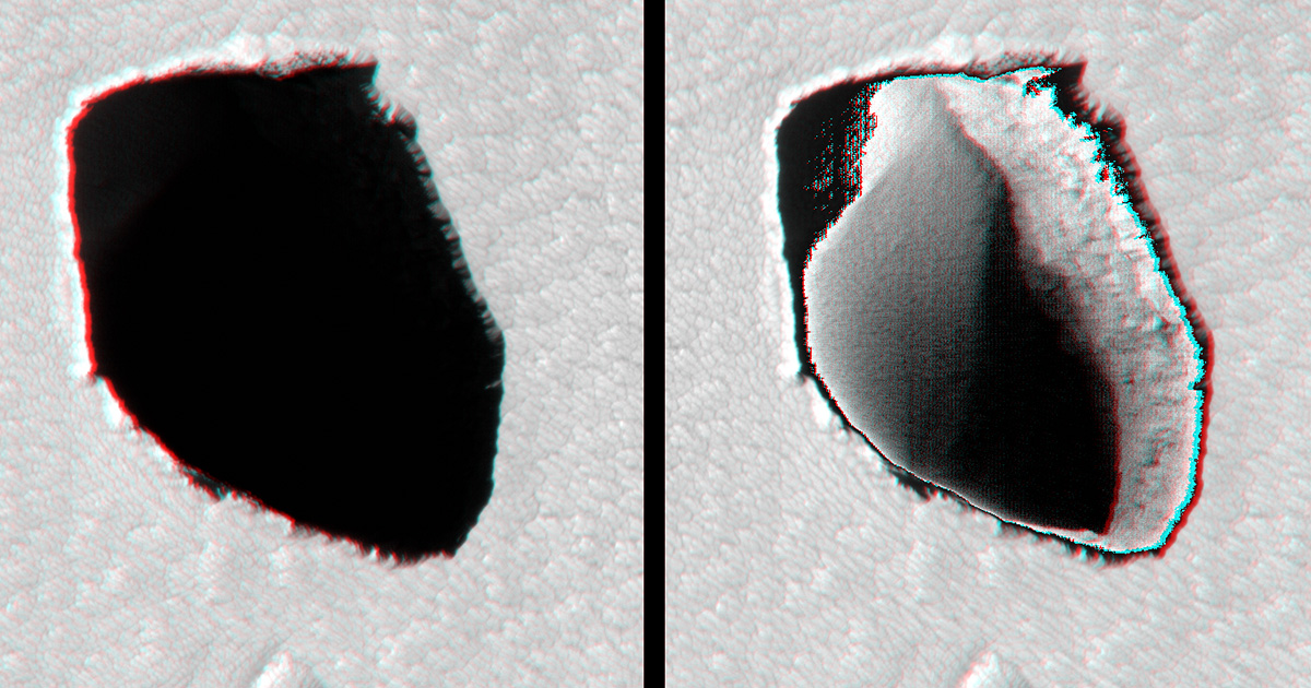 NASA’s spacecraft have spotted possible skylights like the one Beyer describes. In 2012, for instance, the MRO took photos of suspected cave skylights up to 225 meters across.