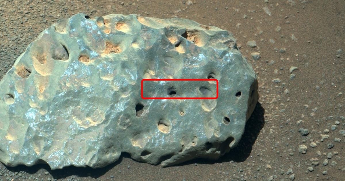 Indeed, a row of smaller round imprints can be seen towards the right hand side of the rock. That’s where Perseverance’s SuperCam instrument penetrated the rock’s outer layers.