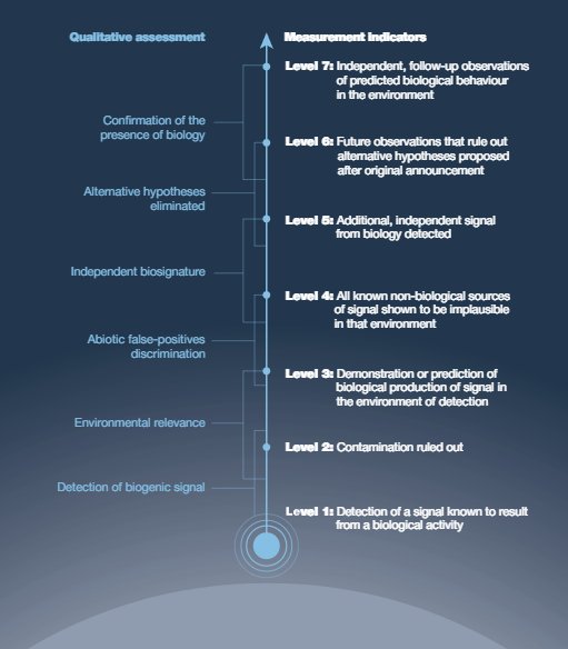 Green and his co-authors propose a confidence of life detection (CoLD) scale to help evaluate any evidence that might be discovered. The scale itself contains seven different levels like a staircase. Each level is a benchmark that must be met before we can proceed to the next step.