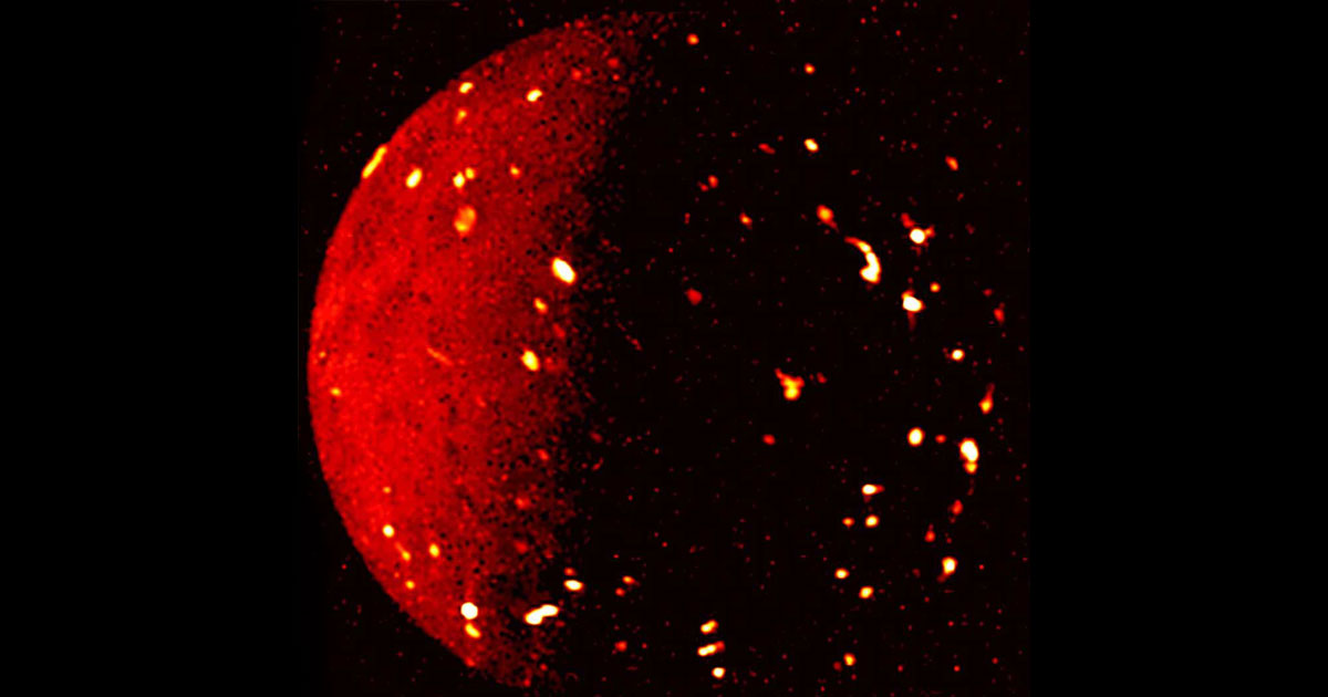 NASA has released a stunning infrared image of Jupiter’s moon Io, snapped from a mere 50,000 miles away.