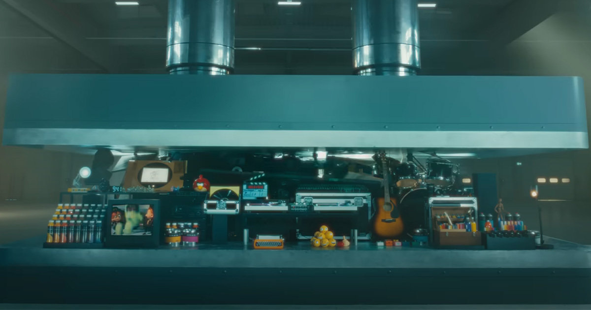 In the ad, Sonny & Cher’s “All I Need Is You” blares in the background as the industrial press crushes, one by one, an “Angry Birds” desk ornament, a guitar, a piano, several paint cans, a metronome, a television, and some books.