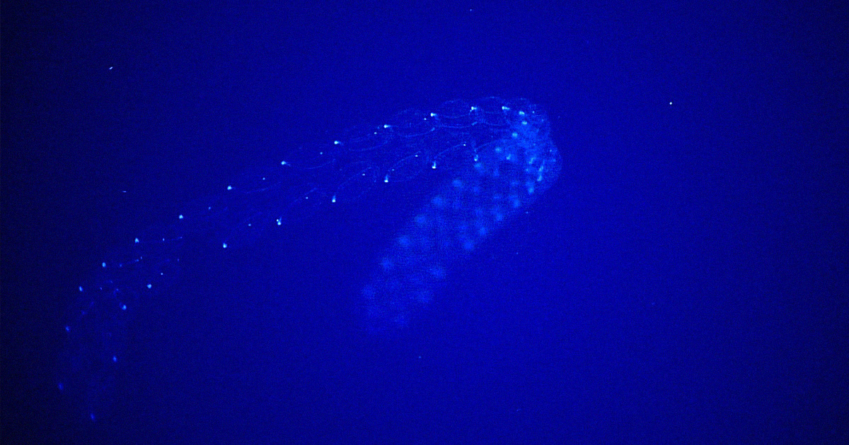 Sea salps are able to form meters-long chains and generally can be found drifting through the ocean in more frequent numbers around June. Thanks to unusually warm weather currents, they’re already showing up in increasing numbers.