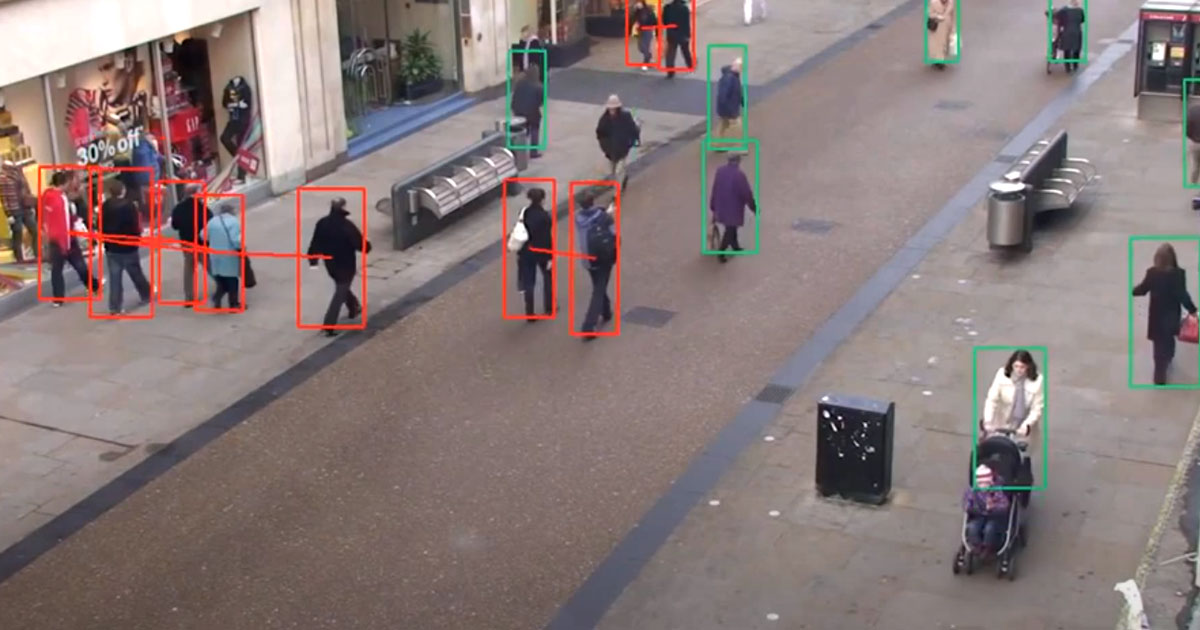 First, the camera system calibrates the input and adjusts what it sees for perspective. A neural network then detects individual pedestrians and draws a box around them. If two bounding boxes come too close within each other, they are highlighted in red.