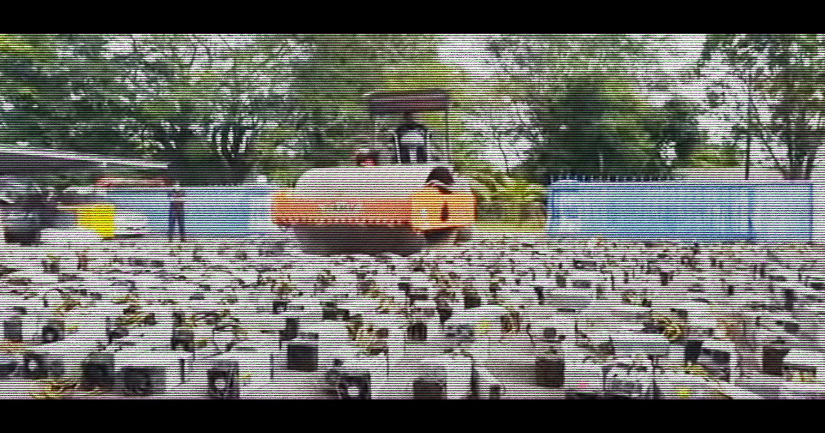 This week, they were destroyed in spectacular fashion when officials laid them all out in a parking lot at police headquarters and ran them over with a steamroller. Check out the video of the action below: