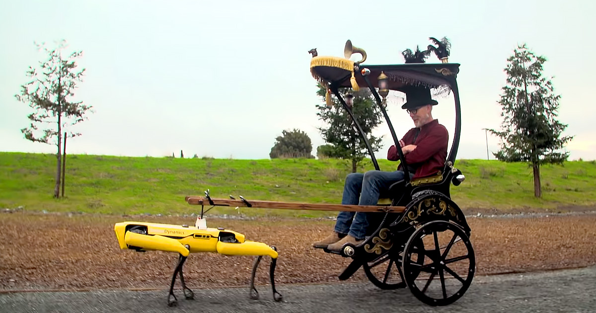 Former “Mythbusters” co-host and YouTube tinkerer Adam Savage has built a one-person rickshaw carriage so that his Boston Dynamics Spot robot can lug him around.