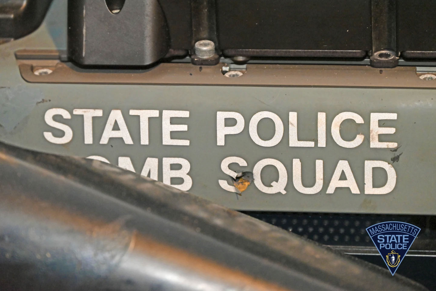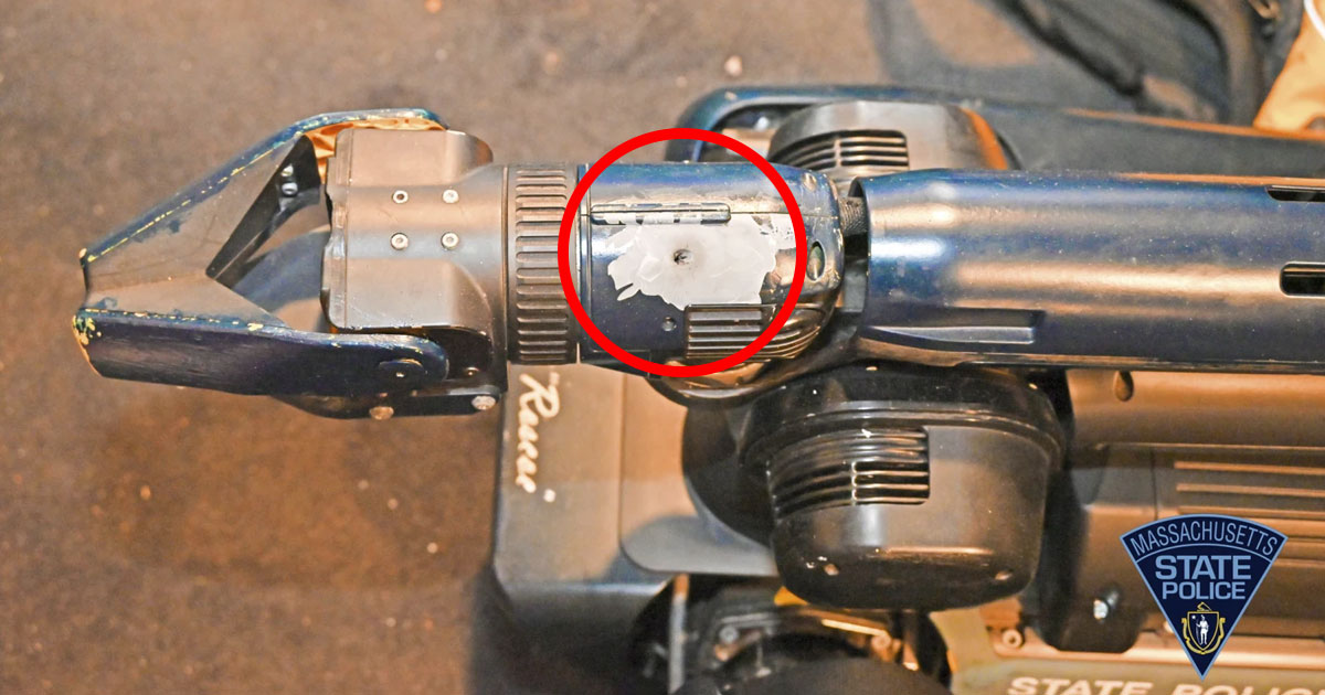Images released by the Massachusetts State Police Department show the gunmetal gray robot with several gunshot “wounds,” denting the its metal shell and stripping off paint.