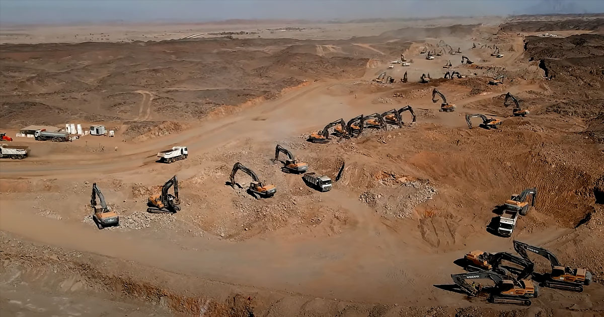 Drone footage shared by Dezeen shows a huge construction site, with dozens of excavators digging a massive trench of epic proportions.