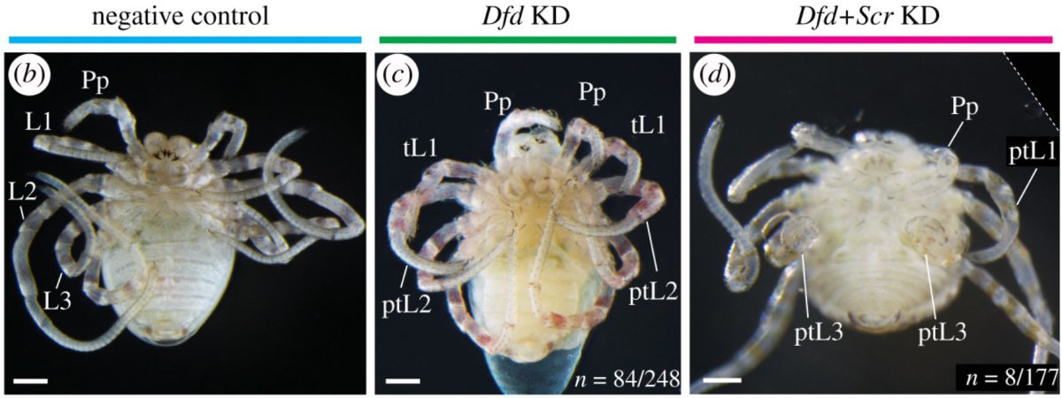 Then, they used a technique called “RNA interference” to shut off a pair of genes associated with leg development in hundreds of embryos of the critter.