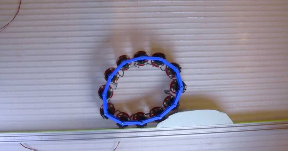 The wheel’s trick is counterintuitive. It’s made up of individual motors that are linked together to form it’s round structure, with each module connected to rubber band-loaded plastic arms that are arranged in such a way to generate opposite torque — an unstable “nonreciprocal” arrangement that normally wouldn’t allow the wheel to move at all.