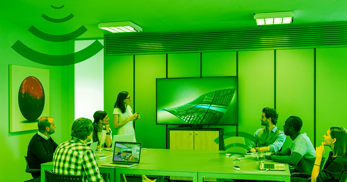 The advantage of this technology is that it doesn’t deal with the shortcomings of having a million devices share the same radio frequency spectrum, especially in busy environments like an office.