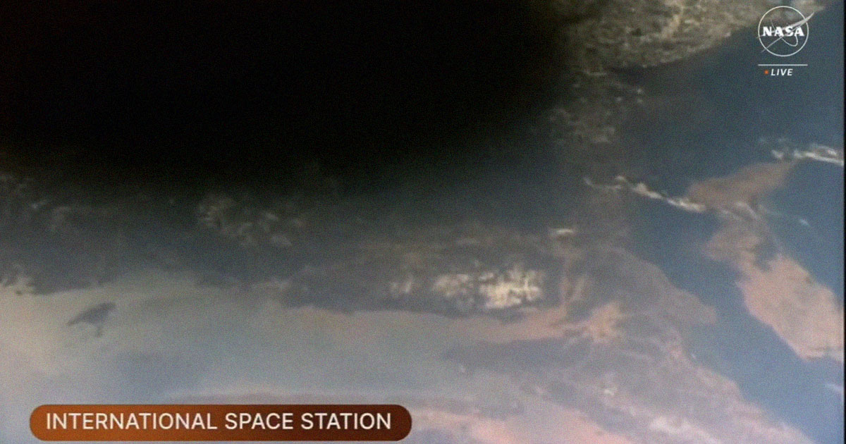 It’s a good time to be an astronaut orbiting the Earth, as crew members get two exceptional views. Not only are they getting to view the Moon passing in front of the Sun, they also get to see the Moon’s shadow as it moves across the continent.