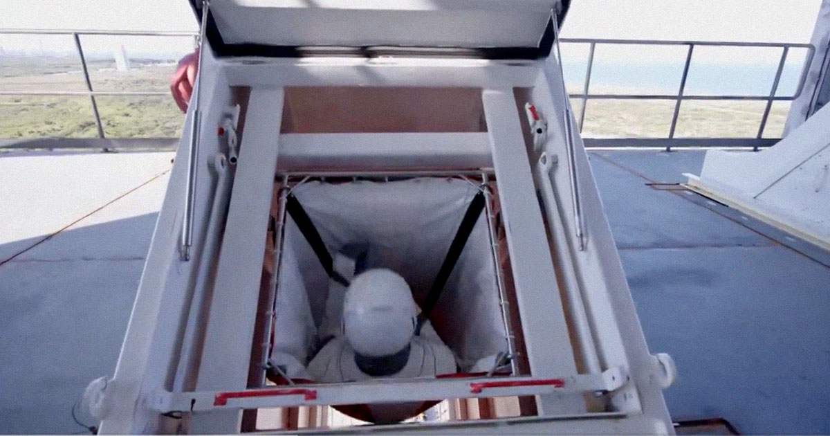 A new video shared by the company on X-formerly-Twitter shows a person dressed in a black and white SpaceX spacesuit zipping down from the tower’s crew pad inside a tube of red and white fabric, an equally exhilarating and terrifying ordeal — especially considering the threat of an exploding rocket right behind you.