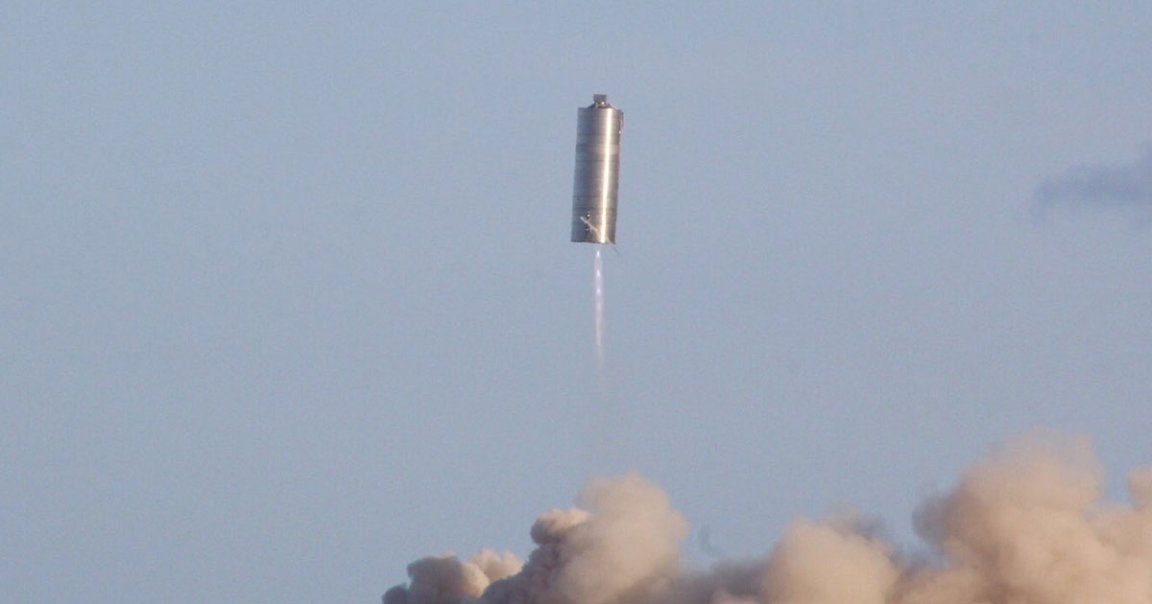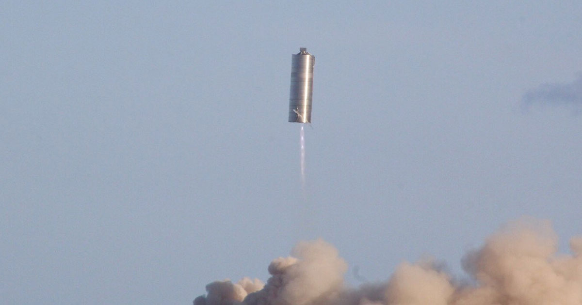 The massive fuel tank, the company’s sixth full-scale testing prototype, lifted off the ground, with only one of the company’s next-generation Raptor rocket engines roaring below.