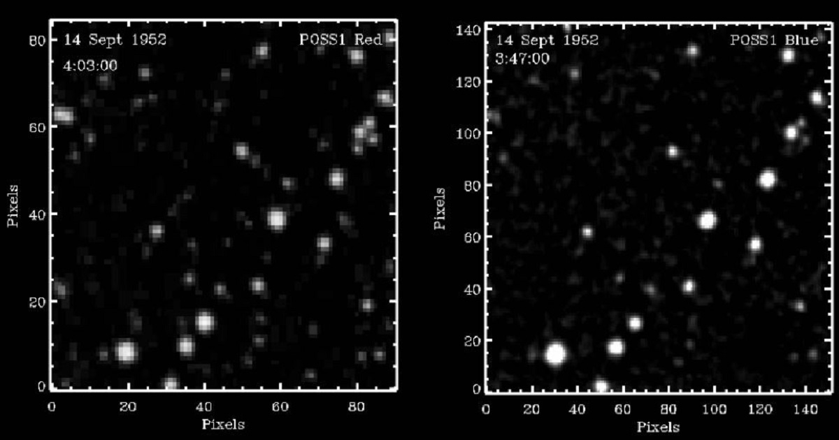 Here’s how it went down: on July 19, 1952, Palomar was taking photos of the night sky at multiple points to get shots of things like asteroids. At 8:52pm that night, it captured an image that featured a cluster of three “star-like” points of light that were as bright as the stars surrounding it, leading to the assumption that they were, you know, stars.