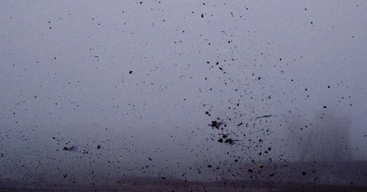 The detailed, slowed down footage shows individual sprays of dirt being kicked up by the rain of metal shrapnel.