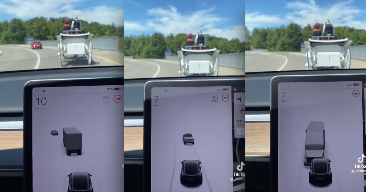 A new viral video, shared on TikTok, shows a Tesla vehicle getting mightily confused by a white, four-wheeled carriage being pulled by a horse.