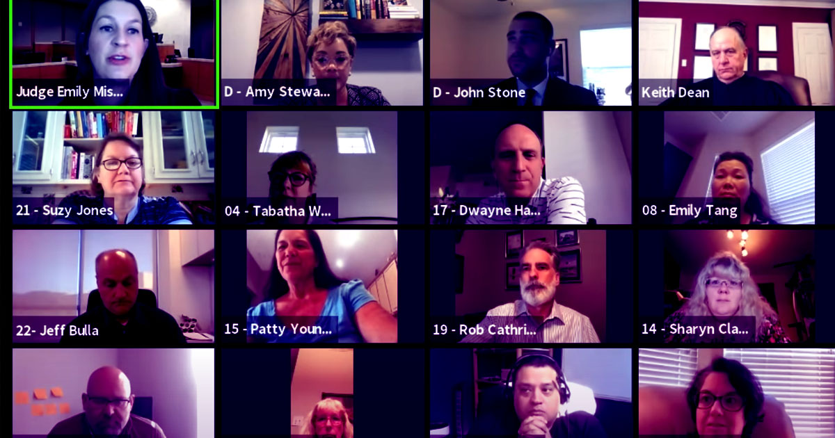 Some jurors spoke without realizing they were muted, others needed help adjusting their displays, and some disconnected from the call — all glitches that Miskel had to stop the proceedings to fix.