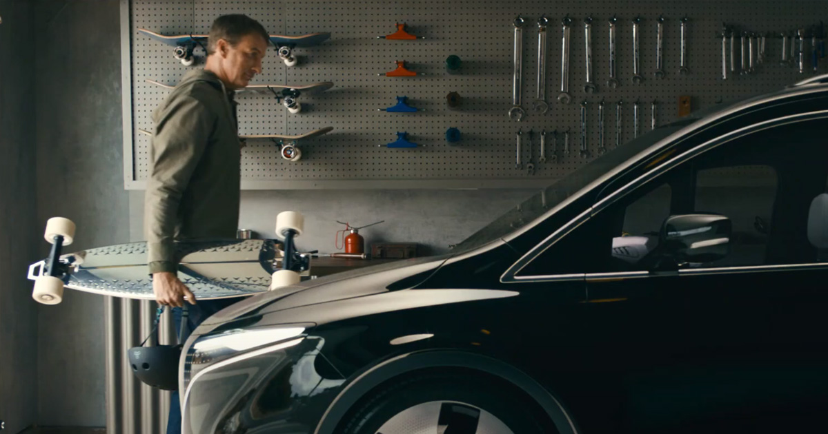 Skateboard legend Tony Hawk has collaborated with German carmaker Mercedes-Benz for a new ad featuring the brand’s new EQT Concept — and a futuristic, electric longboard.