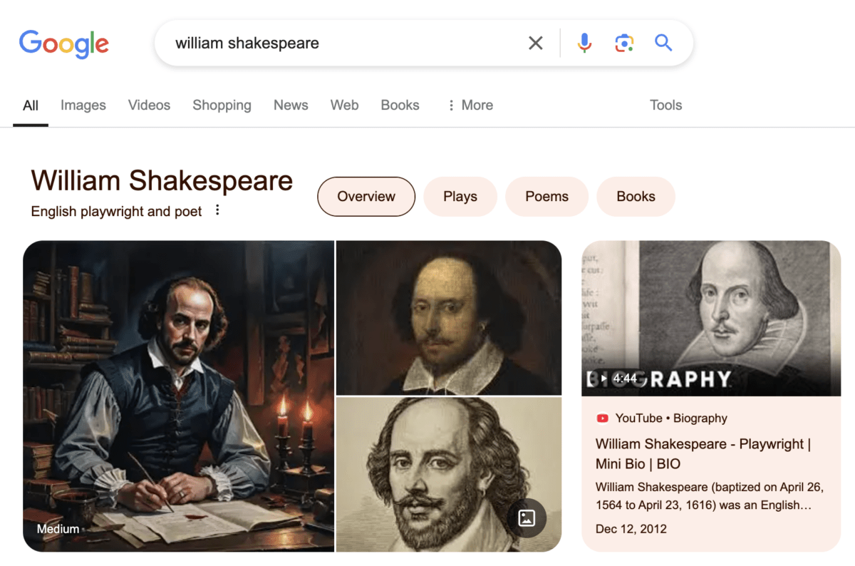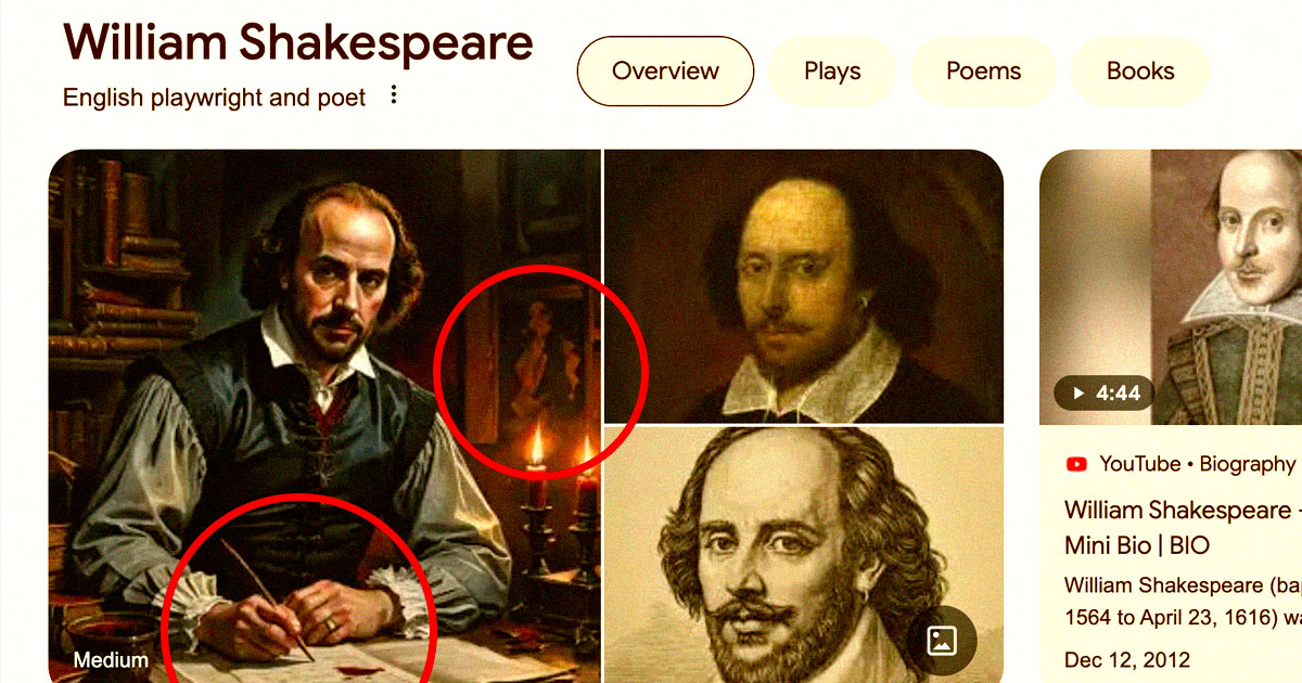 Even just Googling the name “William Shakespeare,” often regarded as the greatest writer in the English language, prioritizes a blatantly AI-generated image of the iconic playwright.