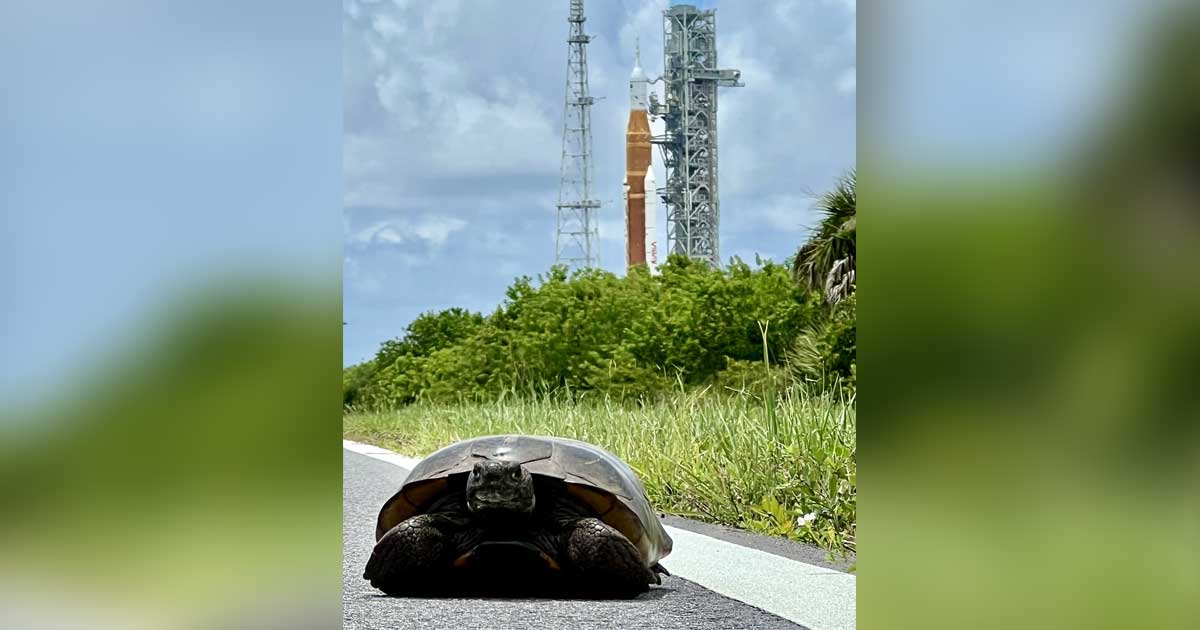 But that’s more bad news! For now, we’re simply enjoying this delightfully endearing photograph of a large turtle, posing confidently in front of an extremely expensive megarocket.