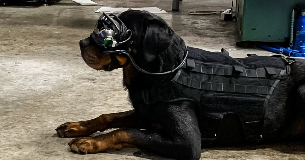 Contractor Command Sight created a prototype that includes a pair of goggles, a camera, and display that fits over the dog’s eyes. A visual indicator gives the dog visual cues.