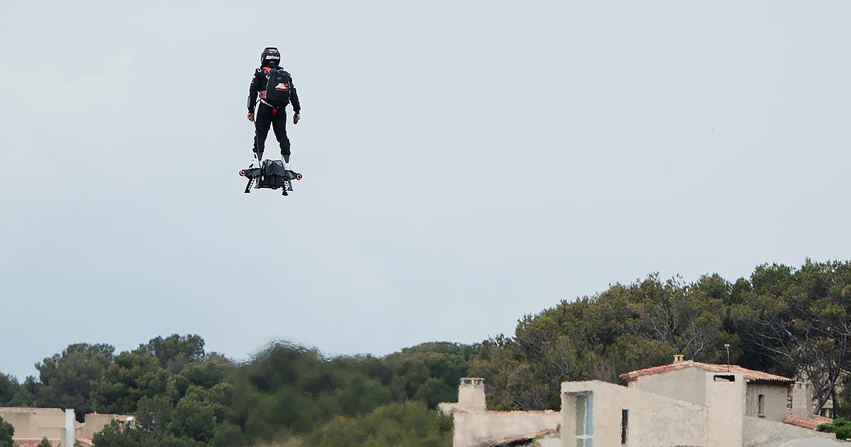 Zapata’s eponymous company shows off the Flyboard Air on its website, calling it a “turboprop board capable of unprecedented mobility.”