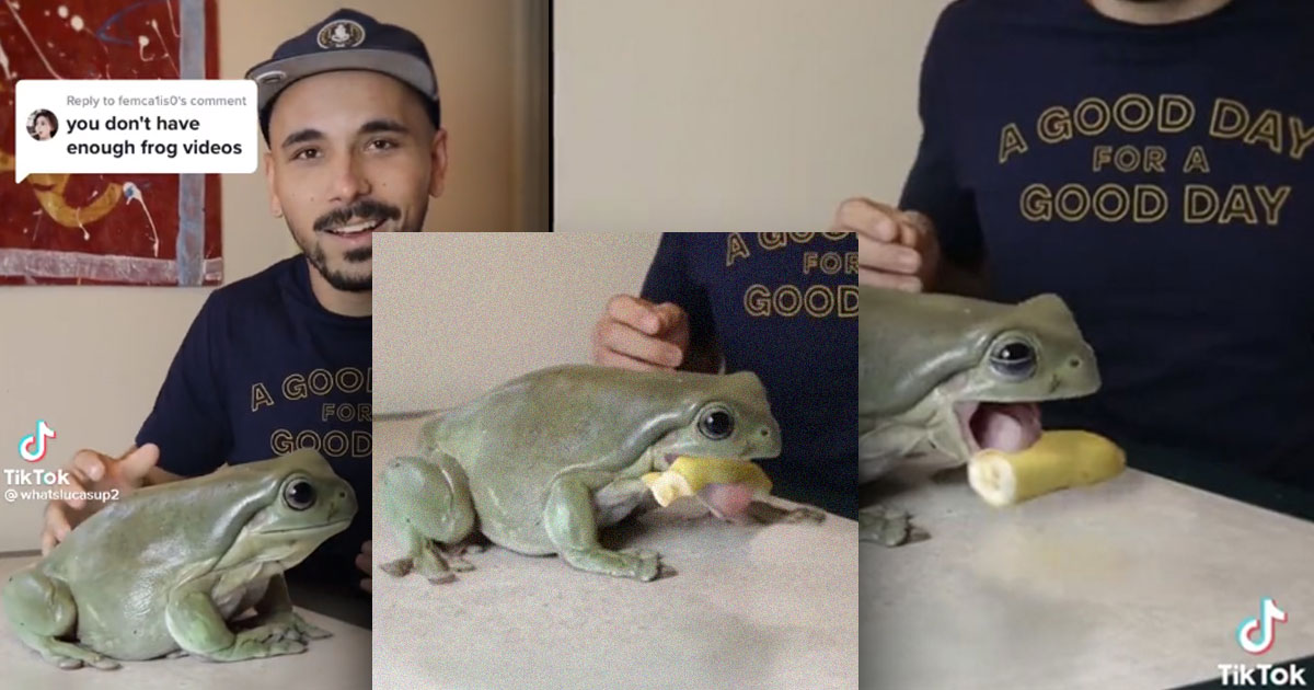 Dumpy — gotta say: perfect frog name — is owned by videographer and Frog Guy Lucas Peterson, who 0n Wednesday posted a now- viral TikTok of his convincingly massive pet. In the video, our Big Boi froggo can be seen just hangin’ out, eating massive chunks of a banana in enormous gulps. Alas, though, the clip is really just an editing flex on Peterson’s behalf.