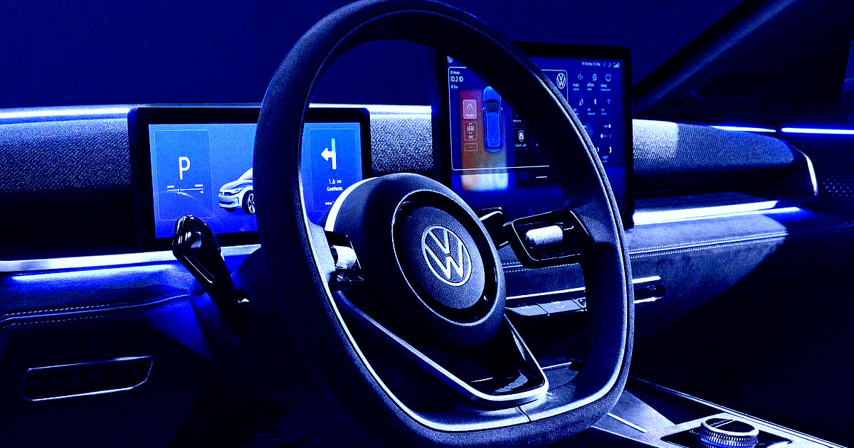 Volkswagen says future interior designs will be derived from its ID 2all concept car, an electric four-door vehicle that would cost 25,000 Euros and be sold in Europe. While it still has two screens, one for driver information and one for the infotainment system, the car features physical buttons to control it all.