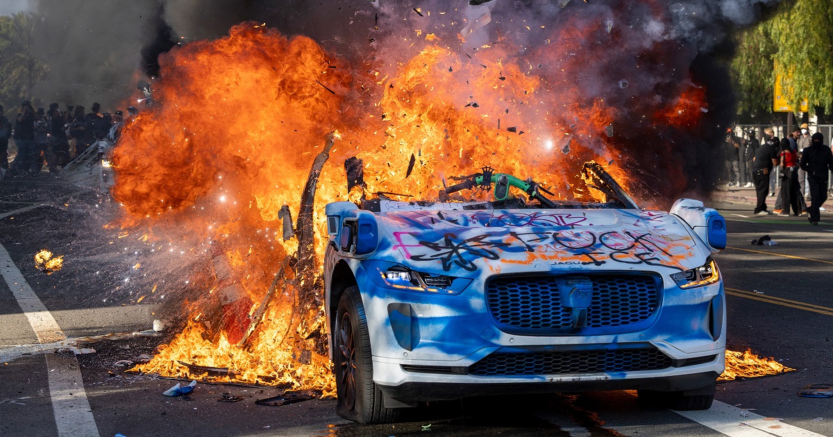 Downtown Los Angeles was a literal riot scene on Sunday as people vandalized and torched several Waymo vehicles while protesting nation-wide deportations of undocumented immigrants, according to CNBC, prompting the robotaxi company to shut down service to the area.