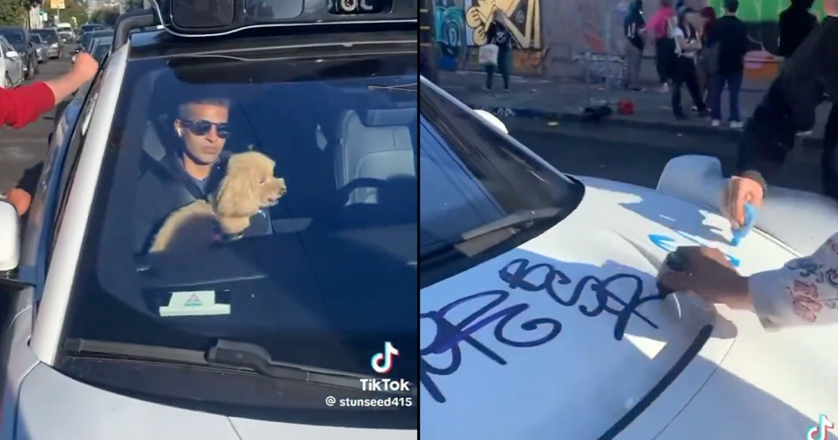 A viral video shows several people cornering a stopped Waymo robotaxi on the street and tagging it with graffiti, while a front seat passenger clutches a small beige poodle — a scene that’s both comical and dystopian in its strangeness.