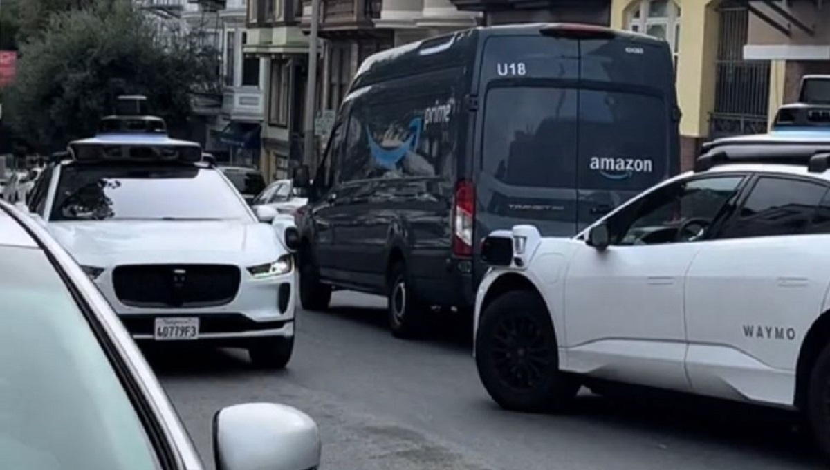 “The Waymo is stuck because the Waymo is trying to go behind the Amazon [truck],” the bystander explains, “but then it’s stuck behind the Waymo, and oh, my god, there’s another Waymo!”