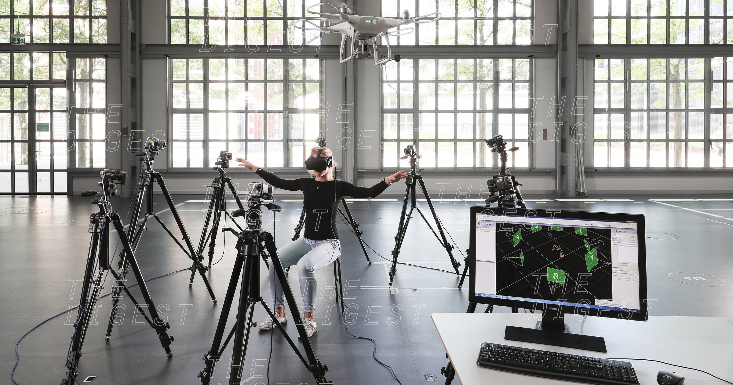 NOW, PRETEND YOU’RE A DRONE. To create their wearable drone controller, the researchers first needed to figure out how people wanted to move their bodies to control a drone. So they placed 19 motion-capture markers and various electrodes all across the upper bodies of 17 volunteers. Then, they asked each volunteer to watch simulated drone footage through virtual reality goggles. This let the volunteer feel like they were seeing through the eyes of a drone.