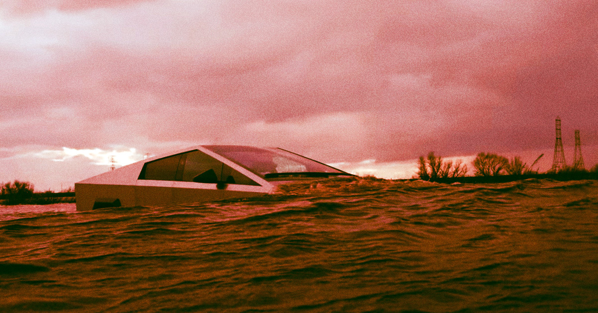 The driving mode raises the ride height of the Cybertruck and then pressurizes the battery pack, which supposedly helps ward off water that might spill in.
