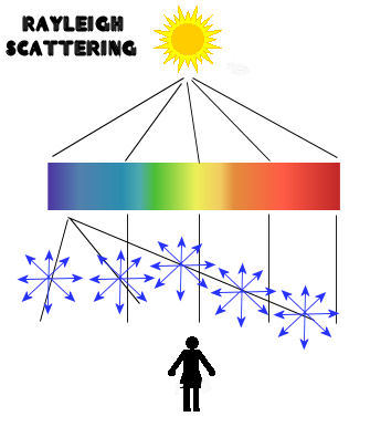 So we’ve established that light can have its otherwise straight path from point A to point B changed when it hits matter. So as the light from the sun comes to Earth and hits the atmosphere, it is scattered throughout the atmosphere and comes to us from all around, instead of just from the direction the sun is in. That’s DSR in a nutshell. Now, why blue?