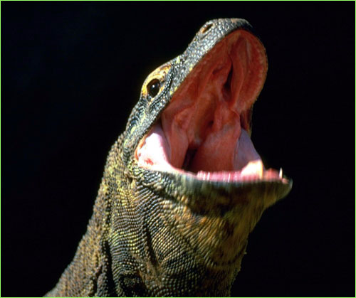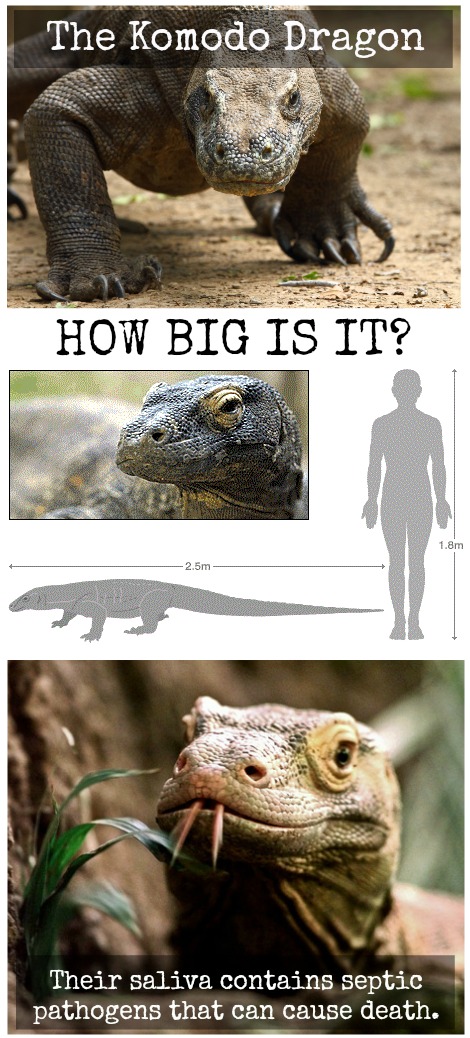 And komodo dragons are not only intimidating because of their size. With strong legs, thick tails, and a broad build, it’s actually their bite that is the most sinister. You see, the komodo has sharp, serrated teeth that are perfectly suited for stripping flesh from bone (not so fun times if it happens to be your flesh). It is said that one 100 pound dragon can consume 80 pounds of meat – almost their entire body weight – in only a few minutes. Furthermore, they are literally walking garburators and will eat any animal, living or dead, bone and all. Whereas most large predators leave about 40% of their kill behind (as they don’t eat bones, hide, etc.) the komodo only leaves behind about 12% of its prey.