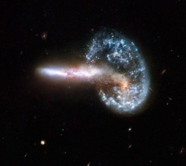 The blue ring on the right was created when the white tail on the left passed through the original galaxy. Think of it like dropping a pebble in some water– gravity draws the water inwards, which then clashes and ripples outwards again. This is the same principal, only on a ridiculously massive scale! When the white tail passed through the galaxy on the right, the gravity drew matter inwards, thus causing it to clash and ripple outward in a propagating density wave.